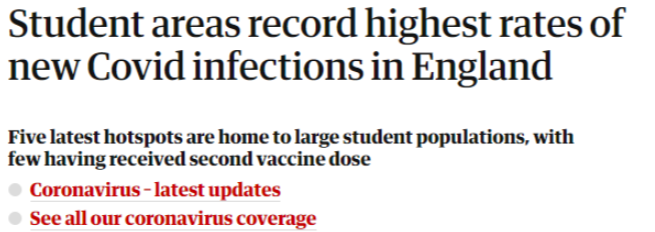据《卫报》调查发现,Delta 变种病毒主要在未接种疫苗或未完成全部剂次接种的年轻人当中传播。目前英格兰前5大新冠感染区都位于大学城。