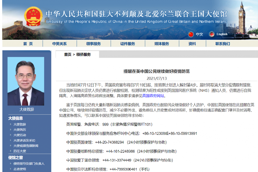 7月13日,中国驻英大使馆发布了近一个月内的第二份疫情防范提醒。
