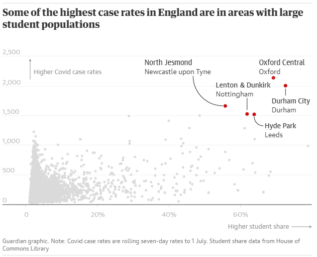 排在第一位的就是 Central Oxford,也就是牛津大学所在地。当地69%的人口都是学生。截至7月5日,Central Oxford 在过去7天里记录的感染率为英格兰最高——每10万人有2,144例感染,几乎是全国平均感染率(每10万人有239例感染)的近10倍!根据牛津郡县议会公共卫生主任 Ansaf Azhar 的说法,整个城市80% 的病例发生在 18-29 岁年龄段。
