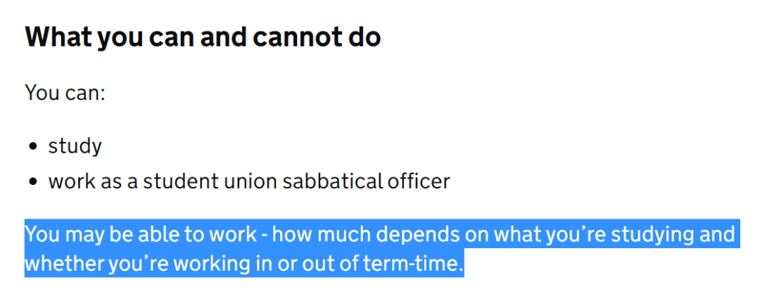 关于是否允许兼职,你可以在BRP上查看,如果写着“ 20 hours max in term time”或者类似的话,就代表着:你可以在学期中每周工作20小时(不超过20个小时),在假期中可以全职工作,且无需寻求任何个人许可。