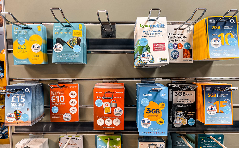 在英国,主要的几个手机运营商有:O2、Vodafone、EE、3(Three),还有几个没有门店的运营商:Giffgaff、Lebara、Lycamobile、Talkmobile、Tescomobile等。