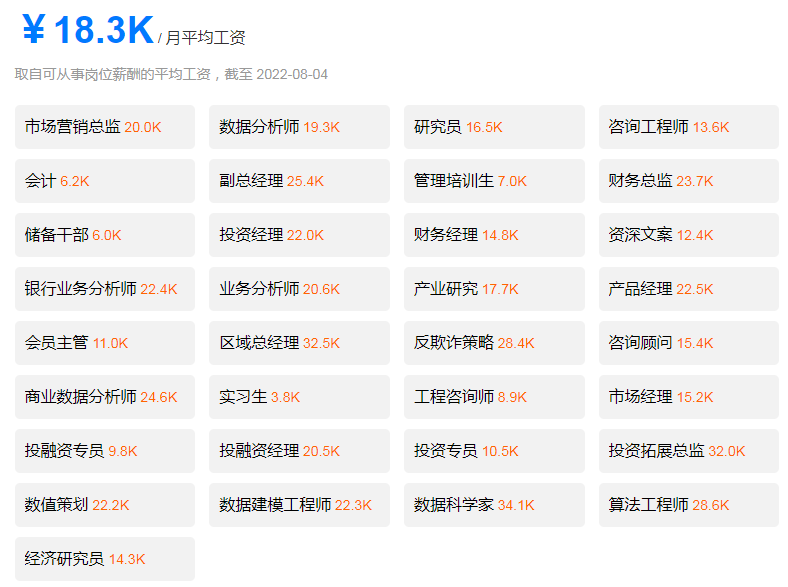 最后看下国内的情况。根据某人才信息网站的数据统计,经济学类专业的职场月均工资达到了18.3K(一线城市),其中: