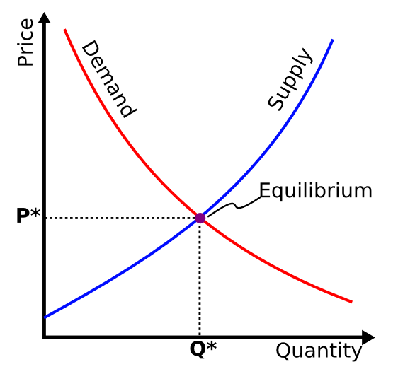 这张图要表达的内容是:在资源(包括个人、家庭、社会、国家等)有限的情况下,通过寻找供给(Supply)和需求(Demand)之间的平衡点(Equilibrium),以达到资源的最优化配置。这是所有经济学研究理论最重要,也是最底层的逻辑。现代经济学学习会涉及的其他原理及模型,都是从这个基本的概念衍生出来的。
