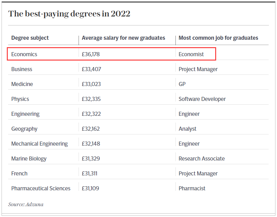 近日,英国《电讯报》还根据就业网站Adzuna的数据,汇总了2022年最有价值、薪资最高的专业。从下表可以看到,经济学专业的毕业生平均薪资位列榜首,达到了36,178英镑。