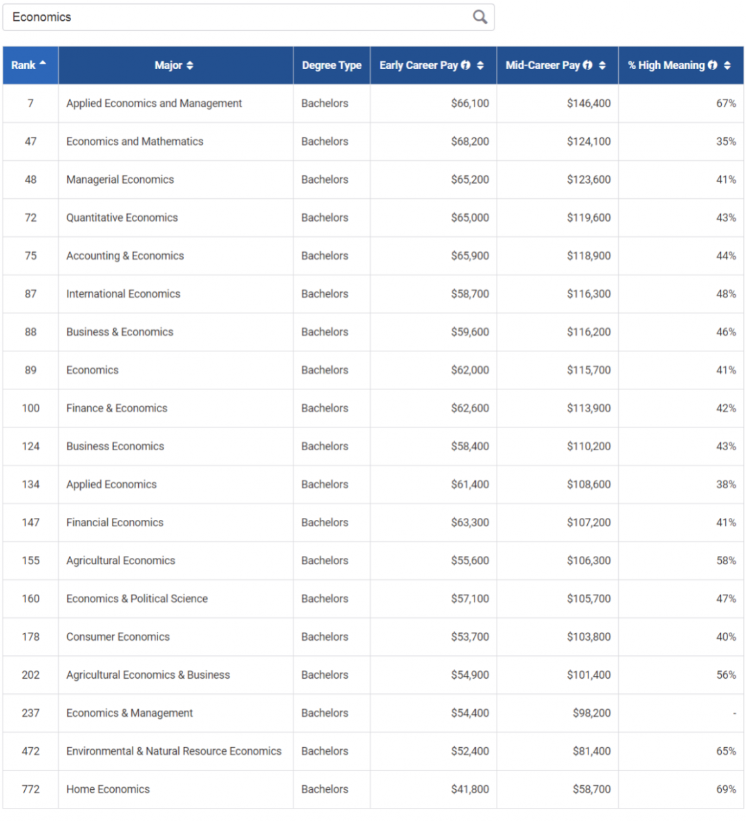 另据Payscale 2021年的专业薪酬统计,经济学相关专业的本科毕业生,职业初期阶段的年薪中位数在41,800~66,100美元之间,而到职业生涯中后期,就能达到58,700~146,400美元。