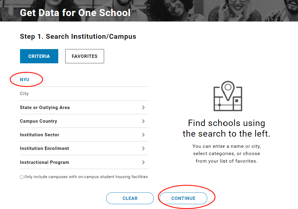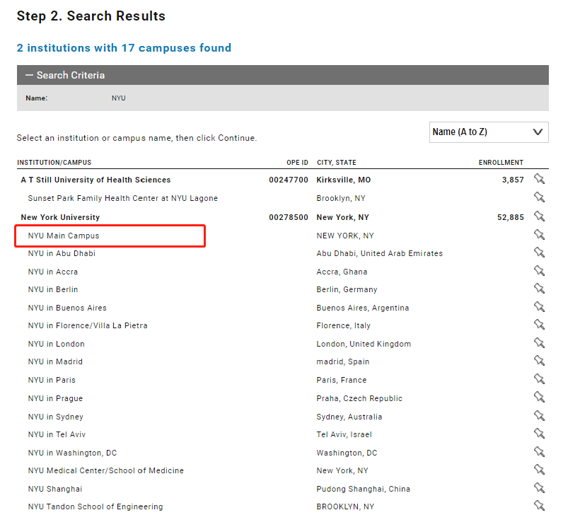 同学们可以在搜索栏里搜索自己的学校,例如:NYU,点击 CONTINUE