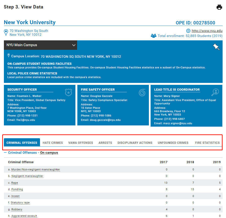 美国教育部每年都会统计各个校园的安全信息,并且记录最近三年内各个校区的犯罪率信息。在美国教育部校园安全信息查询网上,学生可以选择查询单个学校,或者对比几所学校的安全系数。