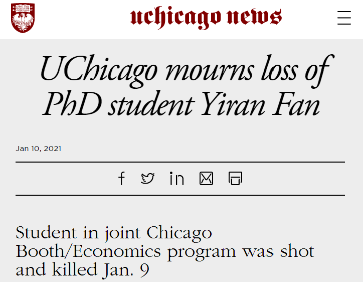 2021年1月9日,美国芝加哥发生连环枪击案,一名32岁的非洲裔枪手南丁格尔开枪,导致了至少三人死亡,四人受伤。其中,年仅30岁的中国博士生范轶然,在海德公园附近停车场的车内被击中头部而不幸身亡。