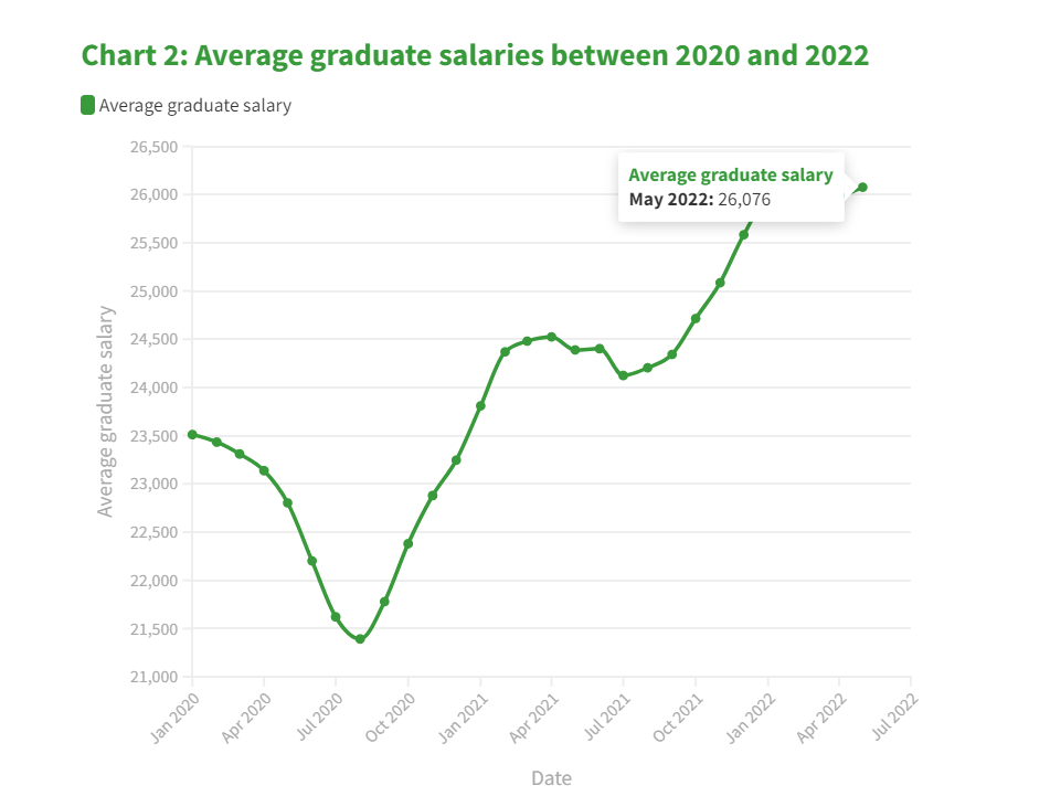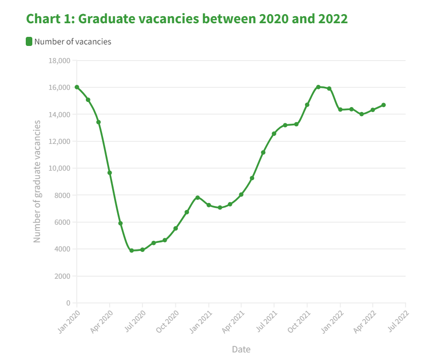 据英国求职网站 Adzuna 发布的最新毕业生薪酬报告显示,2022 年 5 月,英国发布了 14,690 个毕业生空缺职位,比去年同期的 9,265 个增加了 59%。