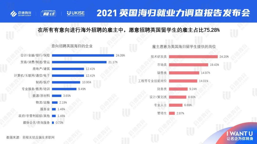 《2021英国海归就业力调查报告》显示,近八成英国海归可以在 3 个月内找到第一份工作。从国内雇主角度来看,在所有有意向进行海外招聘的雇主中,愿意招聘英国留学生的雇主占比 75.28%。