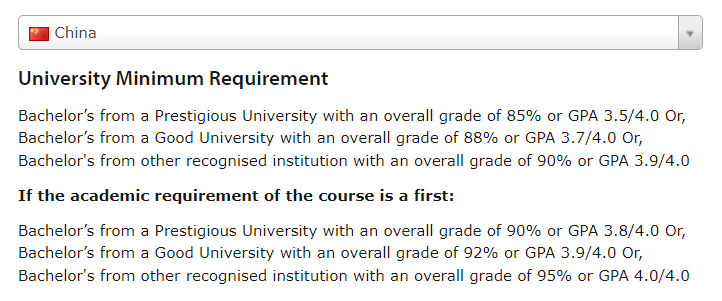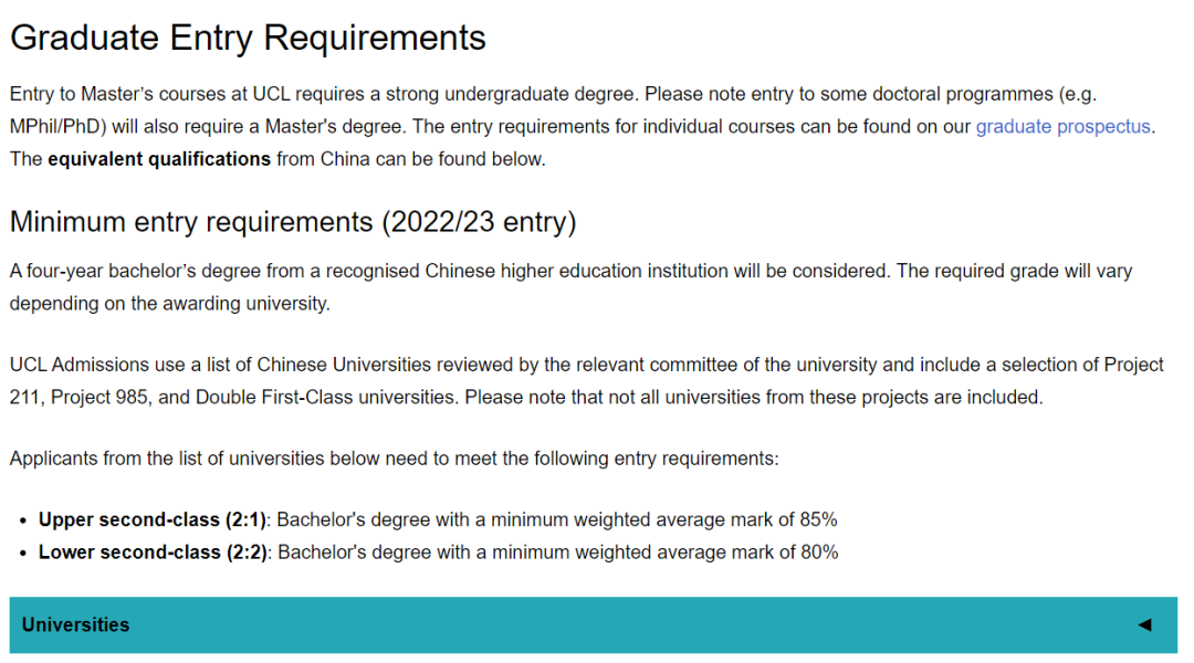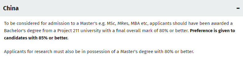 无独有偶,帝国理工学院也明确表示:想要在帝国理工学院入读硕士学位的中国学生,应该已获得 211 项目大学的学士学位,且最终总成绩至少为 80%,优先考虑成绩在 85% 以上的候选人。
