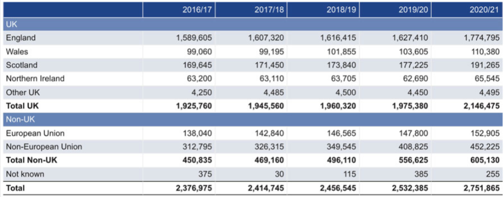 英国高等教育统计局 (HESA) 发布的数据显示,2020/21 学年共有 605,130 名国际学生入学。这比 2019/20 学年同比增长近 9%,并延续了过去五年英国高等教育的稳定增长模式。
