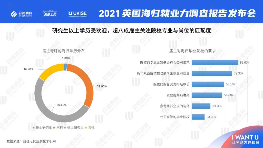 并有近 80% 的雇主认为海归可以胜任工作要求。研究生以上学历受欢迎,超八成雇主关注院校专业与岗位的匹配度。