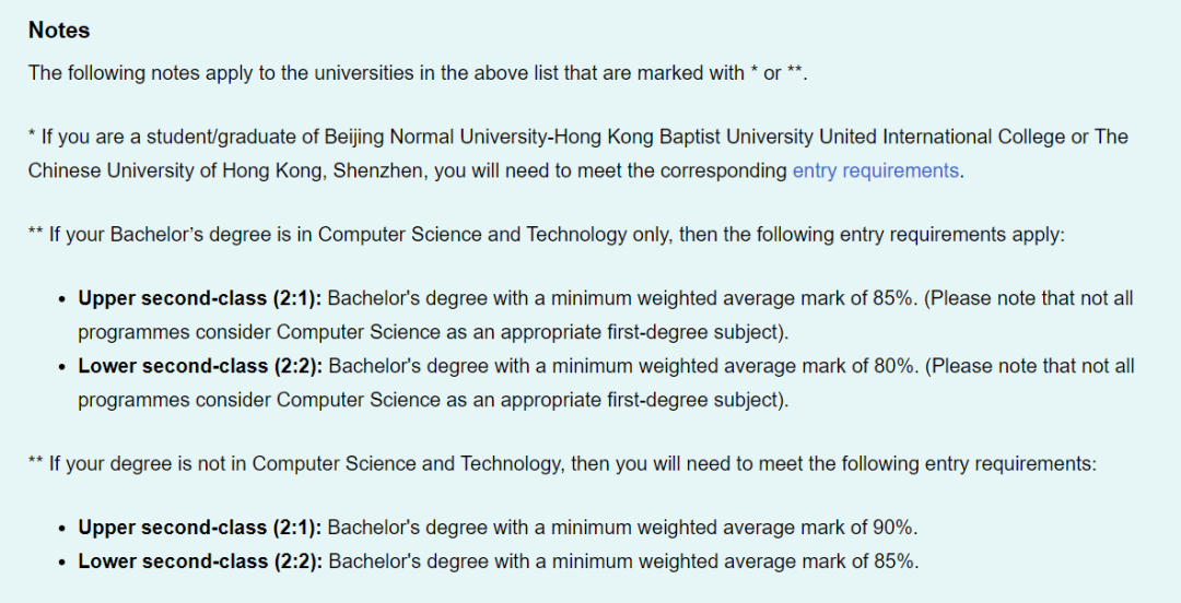 对于名单中标 ** 的 7 所大学,如果你是计算机科学与技术专业学士学位,则适用以下入学要求: