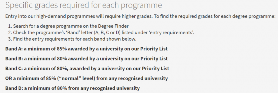 Band C:接受 Priority List 院校中的学生,且均分需在 80% 以上;或受认可的院校的学生,且均分在 85% 以上;