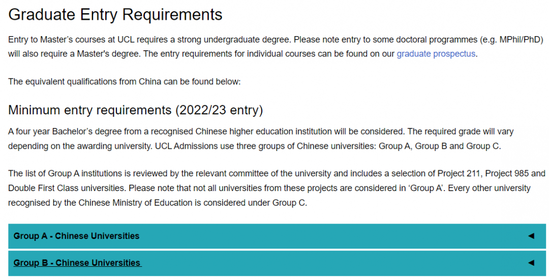 其中,Group A 共有院校 77 所,均为 211、985 和双一流大学。但 UCL 强调并非所有 211、985 和双一流大学都能被列入“Group A”!