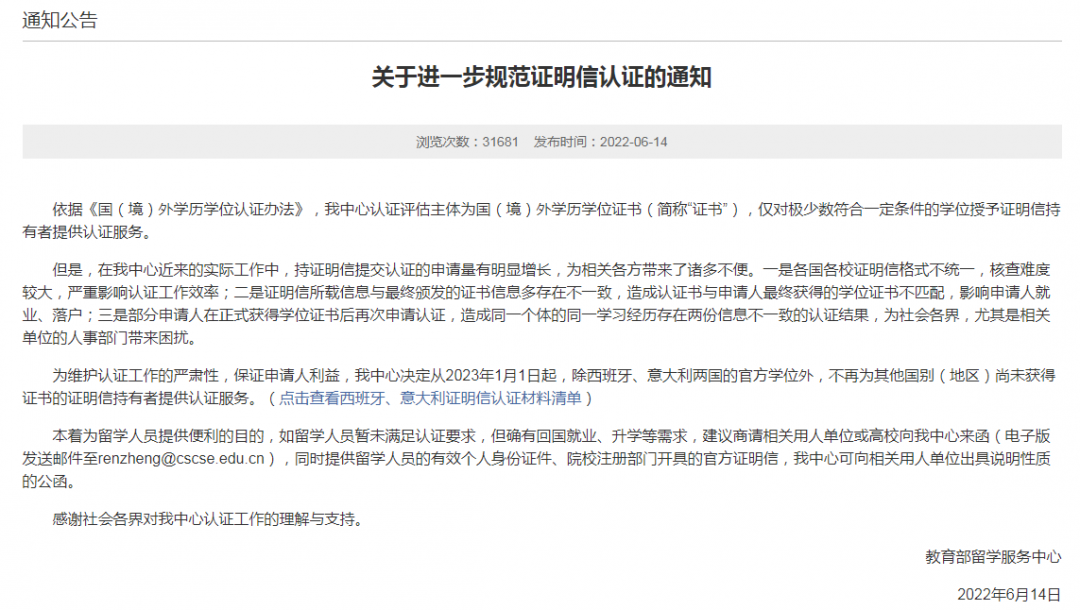 通知明确,从2023年1月1日起,除西班牙、意大利两国的官方学位外,将不再为其他国别(地区)尚未获得证书的证明信持有者提供认证服务。