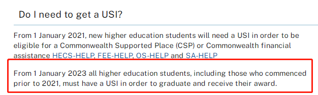 从 2023 年 1 月 1 日起,所有接受高等教育的学生,包括在 2021 年之前入学的学生,都必须拥有 USI 才能毕业并获得证书。