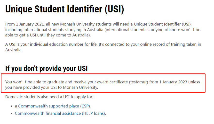 此外,蒙纳士大学的官网还更新了一个要求,从 2023 年 1 月 1 日起,除非你已将你的 USI 提供给蒙纳士大学,否则你将无法毕业并获得毕业证书。