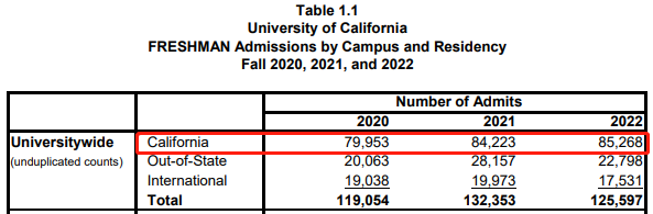 2022 年,UC 本科共发放 125,597 份大一录取。其中,州内学生录取共计 85,268 人,比去年的 84,223 名学生增加了 1,045 人,增幅为 1.2%。这也是 UC 历史上本地学生人数最多的一届。而这种增长得益于大量高素质加州学生群体的表现,以及州政府对入学率增长的支持。