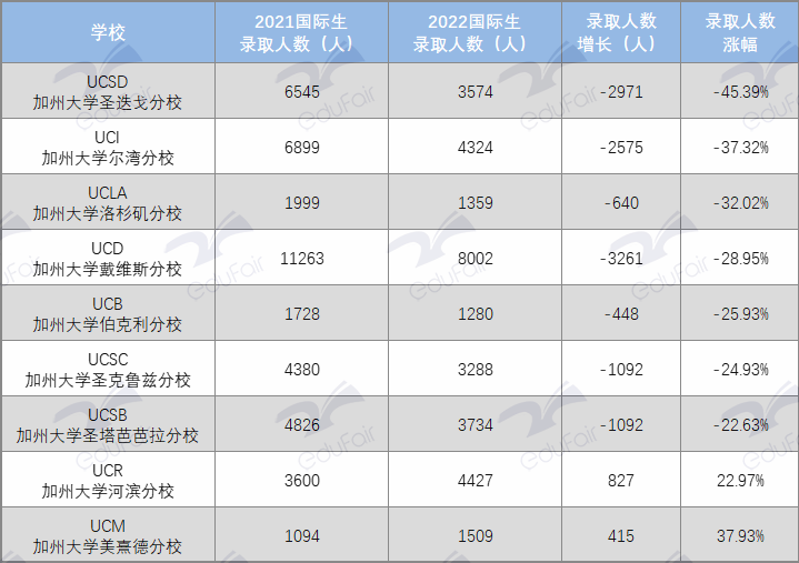 可以看到,除了 UCM 和 UCR 之外,其余所有学校录取的国际生人数均大幅下降,下降比例都在 20% 以上。尤其是 UCSD,国际生录取人数从 2021 年的 6545 人疯狂缩减至 3574 人,减少了足足 2971,近乎腰斩。