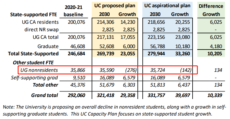 计划中还提到 UCB、UCLA、UCSD 三个校区的扩招名额将占据全部扩招名额的一半,但这也是通过将州外学生名额转为加州学生的方式,增加总体招生名额。