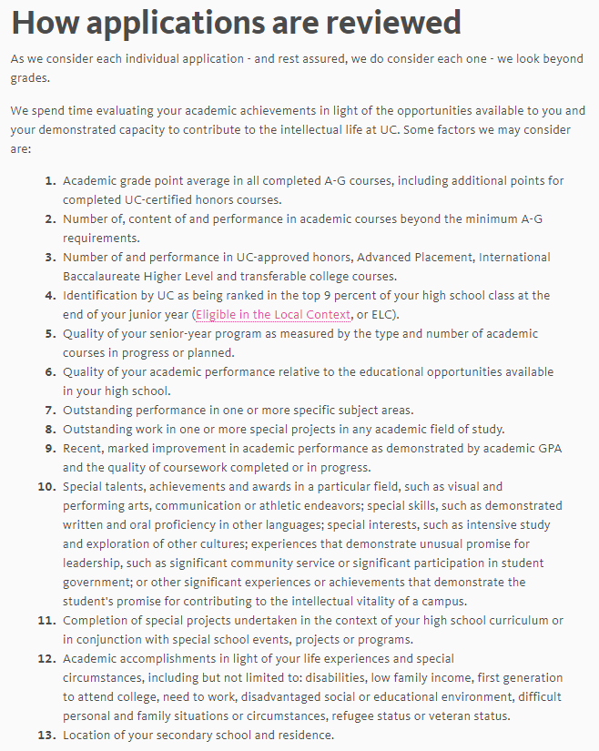 根据 UC 系统的网站显示,系统内所有学校对新生申请者的衡量标准都是相同的。这一标准分为 13 个因素,而这 13 个因素在招生决定中都起着非常重要的作用。