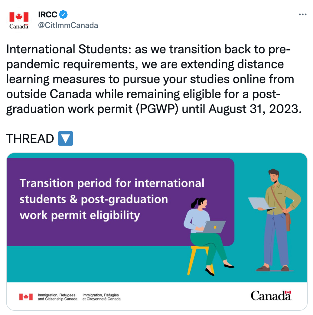 IRCC 于 8 月 25 日在推特上官宣:远程学习政策将延期到 2023 年 8 月 31 日,以便让国际学生有时间返回加拿大。