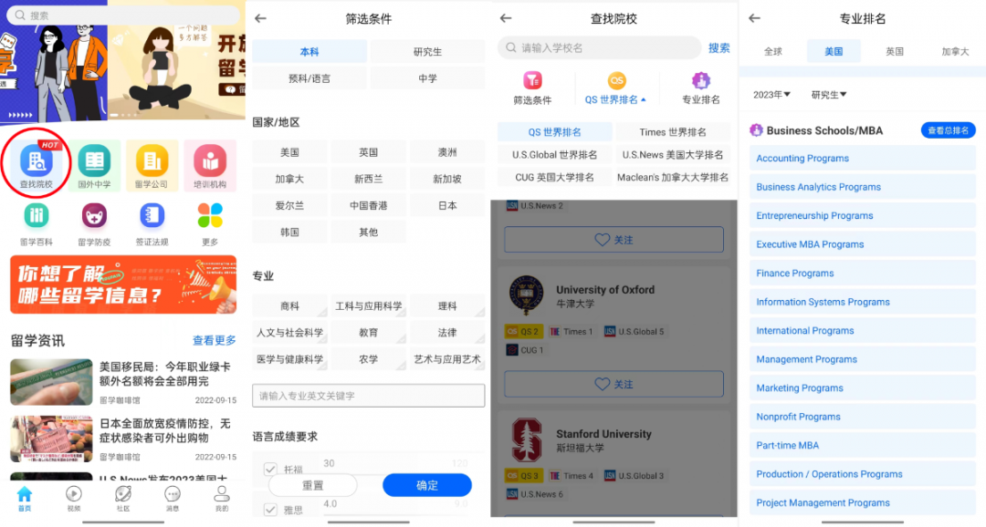 大家可以在【留学咖啡馆】APP 的“查找院校”版块下,可以点击筛选条件,根据国家/地区、专业等进行筛选;也可以根据学校排名、专业排名去选项目。