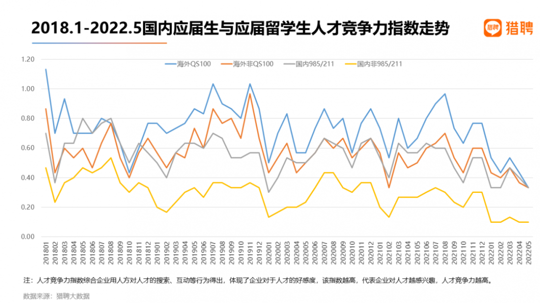 从 2018 年 1 月至 2022 年 5 月,国内外应届生的竞争力指数排序大致是: