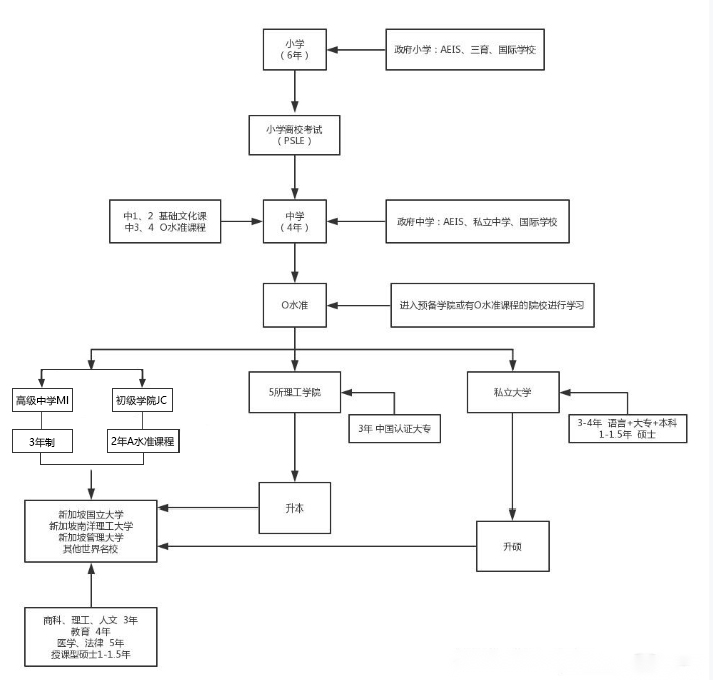 和中国的高等教育体制不同,新加坡延用的是英联邦的教育体制。在10~11年的义务教育结束后,学生如果想参加工作或继续学习,可以根据自己的兴趣和剑桥O-Level考试的成绩,选择进入相应的衔接教育机构。