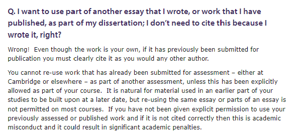 图为剑桥大学在回答关于学术不端的常见问题中,就表示重复提交自己的作业、使用自己以前的论文不标注引用也属于学术不端。