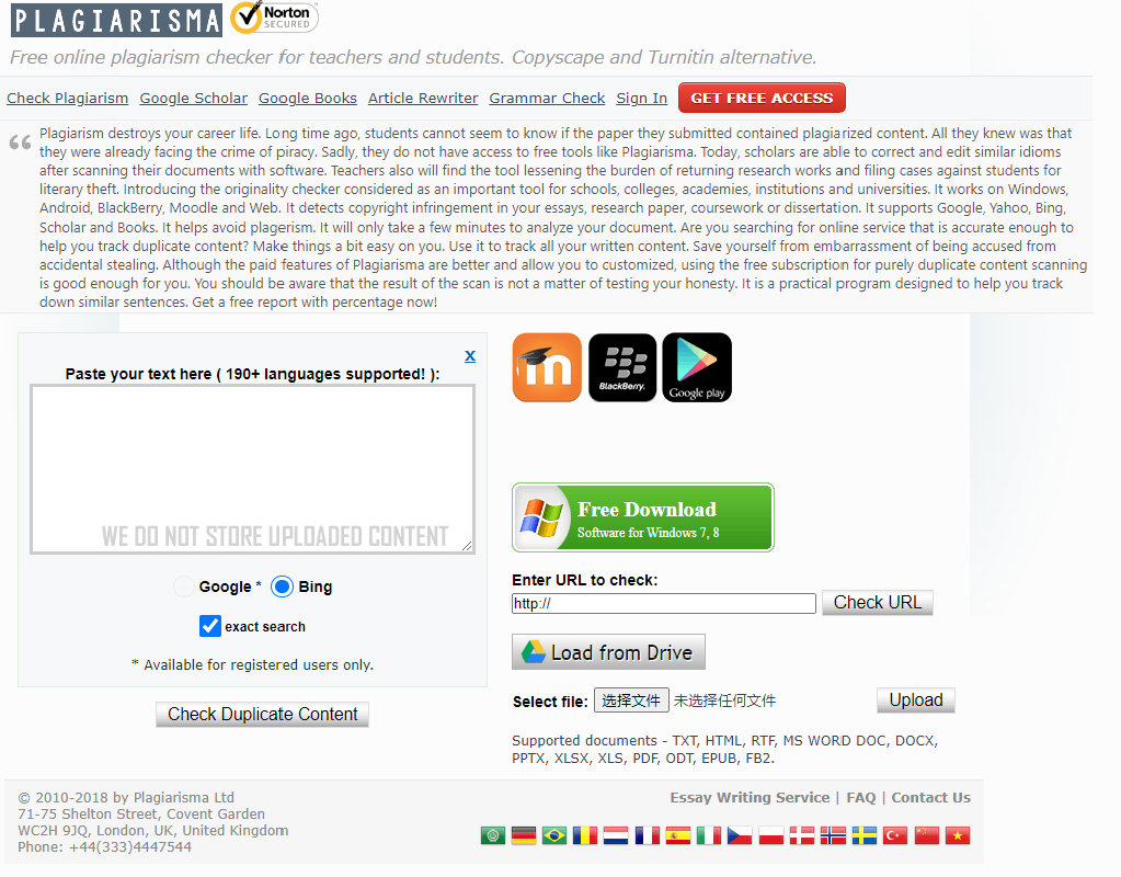 别看网站土里土气的,但是真的很好用。这个网站既可以直接搜索文字(支持190多个语言),支持三种方式查询:复制粘贴、网址和上传文件。不过对于文字来说,通过 Google 查询的选项只提供给注册用户。