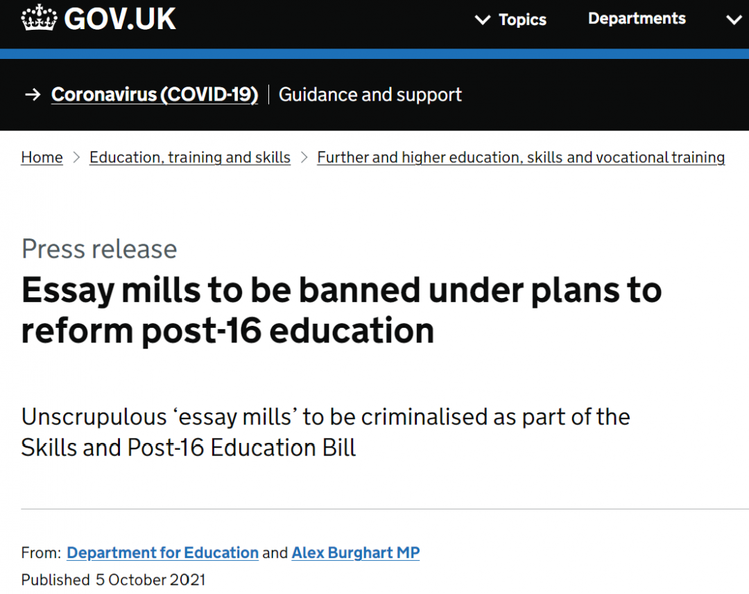 当地时间10月5日,英国政府官网正式发布消息——正在英国议会推进的《高等教育改革法案》将引入新措施,为学生提供代写论文以盈利的服务(论文工厂)将被定为犯罪行为(be criminalised)。