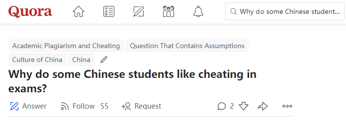 在 Quora(一个国外问答网站)上,就有一个常常被提及的热门问题系列:“为什么中国留学生喜欢作弊?”