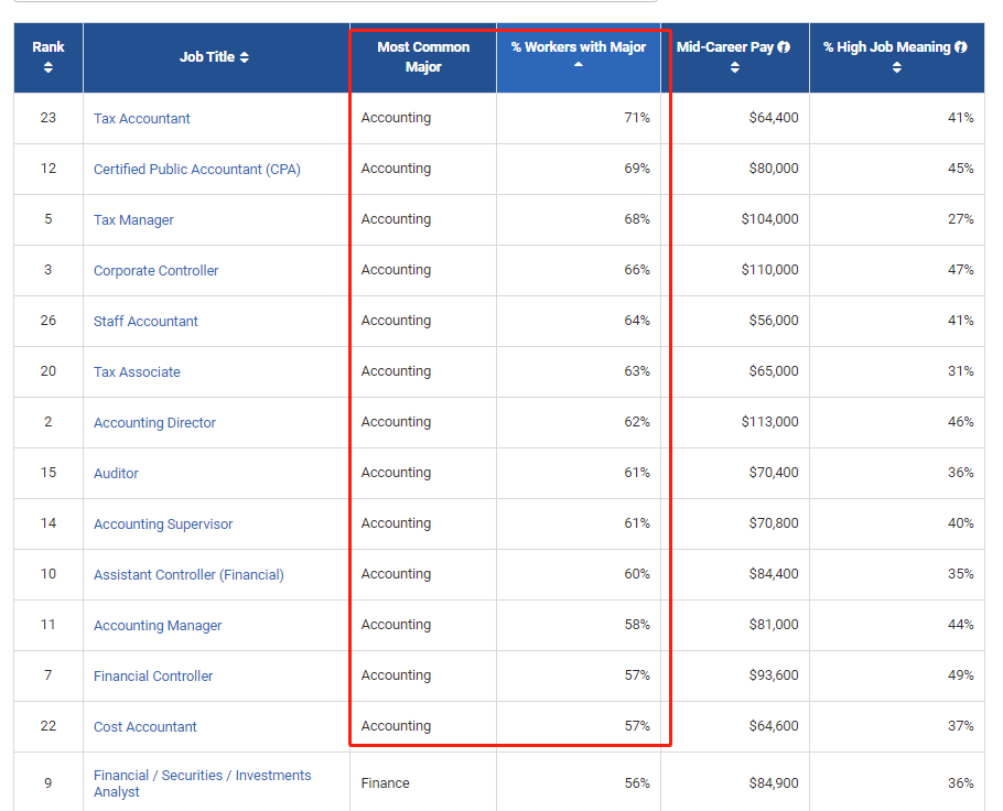 而且会计专业的毕业生,从事本专业相关工作的比例在商科各专业中是最高的,我们可以看到Payscale上的统计,Workers with major 的高比例工作,基本都集中在 Accounting!