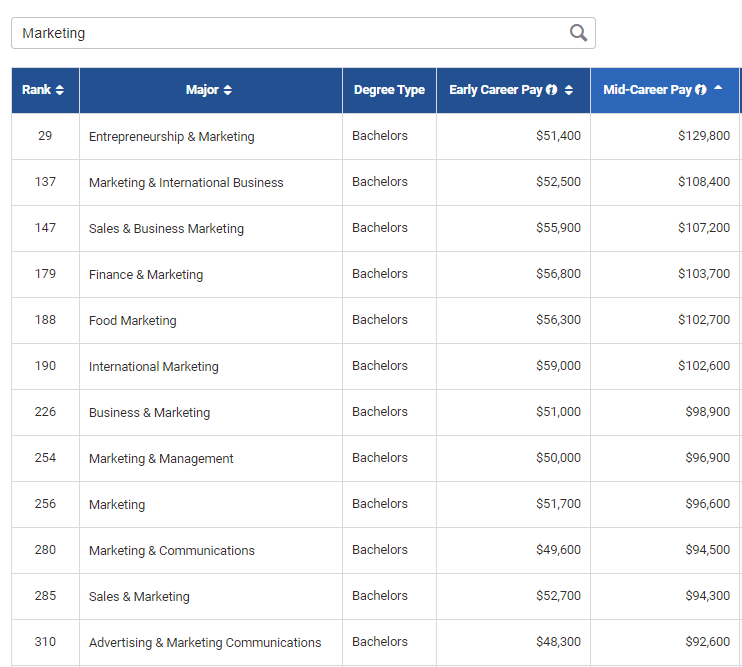 以下是2021年 Payscale 市场相关专业,本科毕业生的薪酬统计: