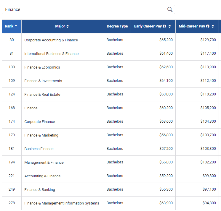 在2021年的 Payscale 的专业薪酬统计里,我们可以看到,金融相关专业的本科毕业生,在职业初期(0-5年)的年薪中位数在 55300-65200 美元之间,到了中后期(10+),年薪中位数就能达到 94800-129700 美元。