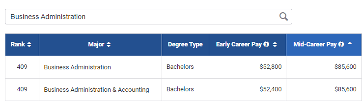 以下是2021年 Payscale 工商管理相关专业,本科毕业生的薪酬统计: