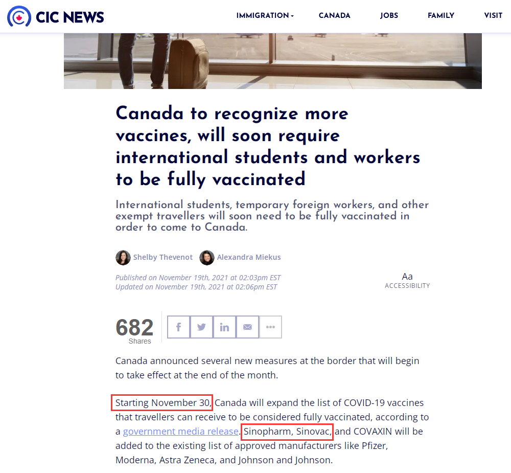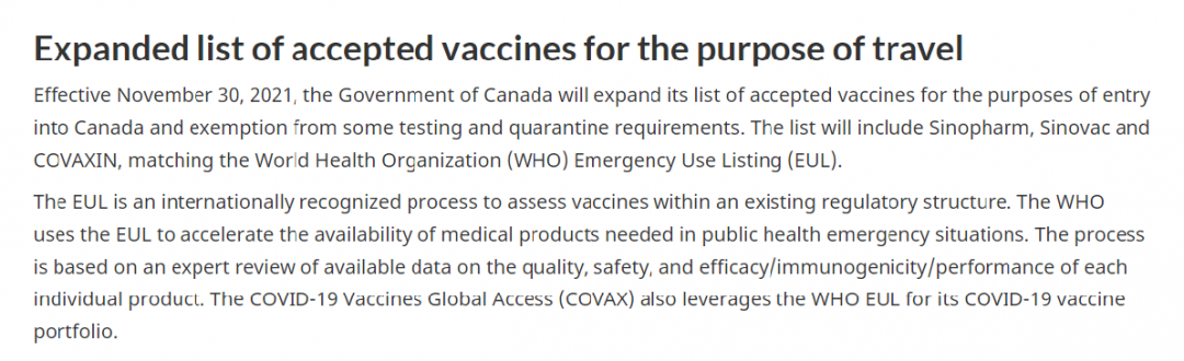根据加拿大新政,从美东时间 2021 年 11 月 30 日凌晨 03:01 开始,加拿大扩大其认可的新冠疫苗清单,其中包括国药集团、科兴两种中国疫苗。
