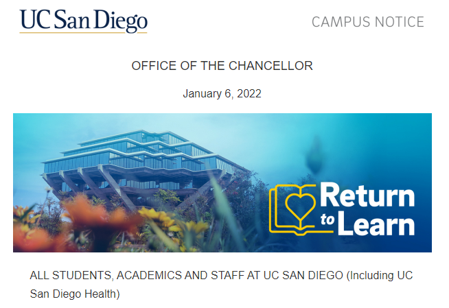 早在 12月,加州大学系统多所院校就官宣 1 月的前两周将实行线上授课,以及要求社区成员在 1 月底前尽快完成新冠疫苗加强剂的接种,具体可以戳《加州大学7所分校宣布,将于1月实行线上授课》。
