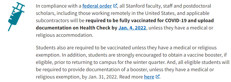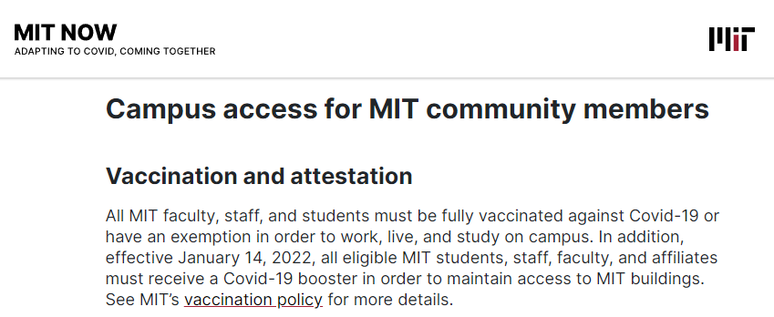 要求所有学生、教职员工和附属机构必须在 2022年 1 月 14 日注射 COVID-19 加强针疫苗,否则将无法进入校园。已经接种过的人群需要在此日期之前将接种信息上传至 covidvacc.mit .edu 或 Atlas。
