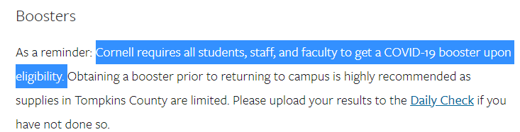 康奈尔大学要求所有符合条件的学生及教职员工尽快接种 COVID-19 疫苗加强针,并且加种证明必须上传到 Daily Check。