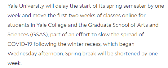 耶鲁大学宣布其春季学期的开学日期推迟一周至 1 月 25 日,并将在前两周为耶鲁学院和 GSAS 学院的学生提供远程授课(持续到 2 月 4 日),面对面教学将于 2 月 7 日恢复。为了弥补延迟开学,接下来的春假也将相应缩短一周。