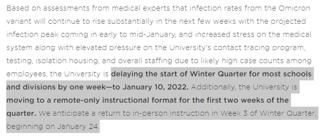 学校将大多数学院的冬季学期开始时间推迟一周至 2022 年 1 月 10 日,相应的,春假也将推迟一周至 3 月 19 日开始。另外,冬季学期的前两周远程授课,从冬季学期的第 3 周,也就是 1 月 24 日开始恢复面对面教学。春季学期将于 3 月 19 日开始.