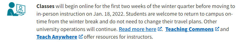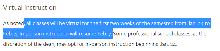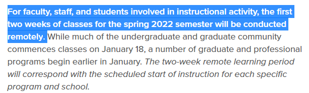 所有本科生和研究生的春季课程都将先以远程的形式开始,从 1 月 5 日持续到 1 月 18 日(而非此前宣布的 1 月 10 日),在此期间,不允许混合授课或面对面的课程。