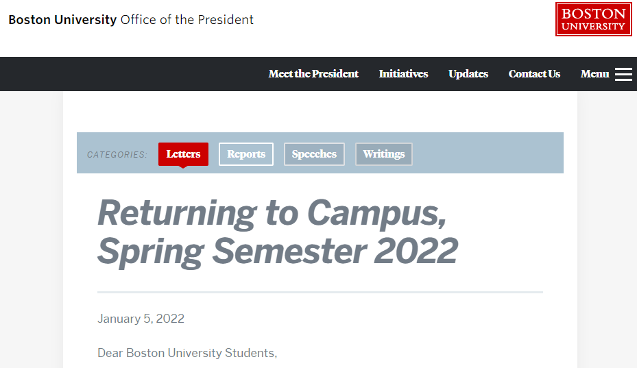 当地时间 1 月 5 日,波士顿大学公布了 2022年春季返校计划。