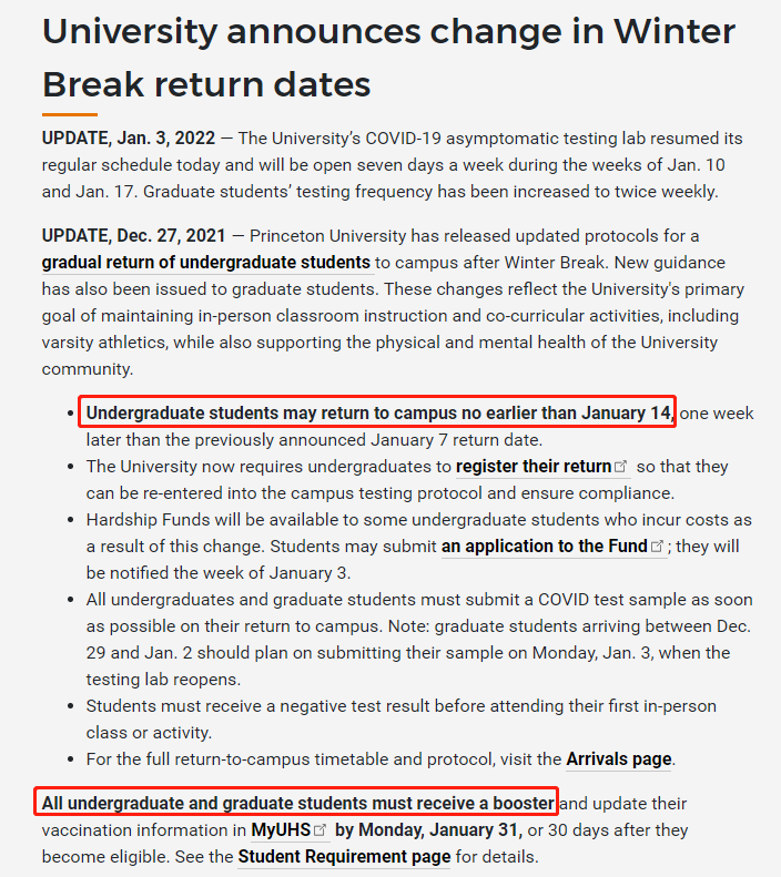 普林斯顿大学还要求所有教职员工、研究人员、教职员工和学生都必须在 2022 年 1 月 31 日前或符合接种条件后 30 日内完成加强针的注射。学生需在 1 月 31 日前将他们的加种证明上传到 MyUHS,所有学生每周将进行 2 次新冠检测。
