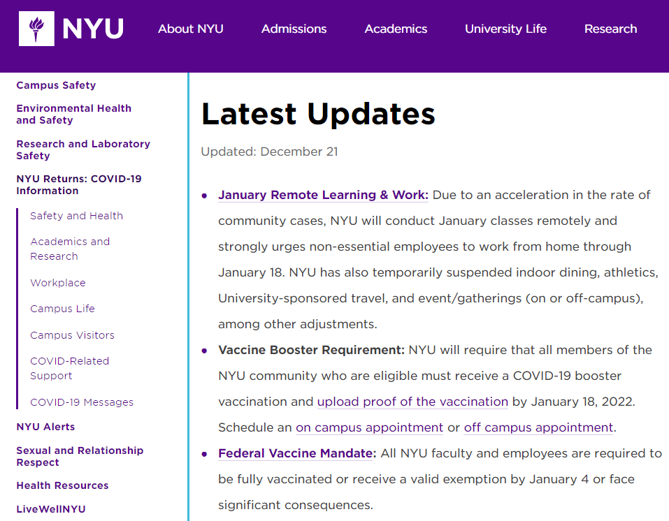纽约大学将在 1 月远程授课,并强烈敦促非必要员工在家工作至 1 月 18 日。纽约大学还暂停了室内用餐、体育运动、大学赞助旅行和活动/聚会(校内或校外)等。