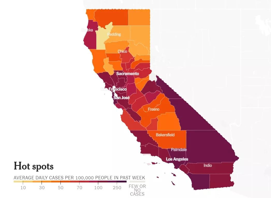 1 月 6 日,整个加州一天新增 84,896 例,平均每日新增近 5.5W!而过去两周,加州的确诊病例数激增了 455%,从热点图上看,加州几乎已经紫红了。